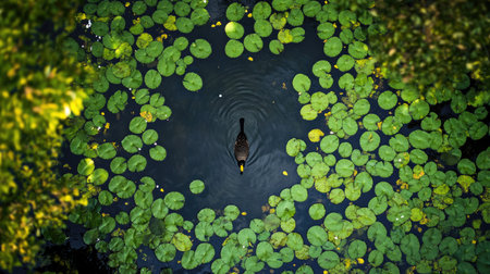 A peaceful scene features a duck swimming amidst vibrant lily pads in a tranquil pond, capturing a serene moment in nature surrounded by lush greenery.