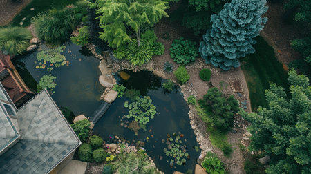 Birds Eye View of Eco-Friendly Garden with Pond and Native Plants for Sustainable Design