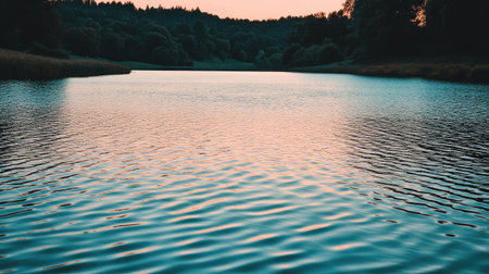 Experience the tranquility of a peaceful lake at dusk, with gentle ripples reflecting soft pastel colors under a serene sky, perfect for nature enthusiasts or landscape photography.