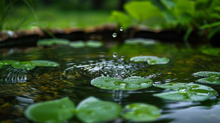 Gentle rainfall on still pond making concentric ripples upper third empty tranquil nature background