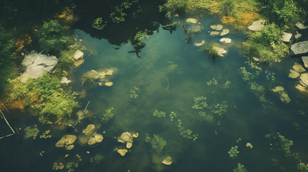 A serene pond surrounded by lush green plants and lily pads, captured from a bird's eye view.
