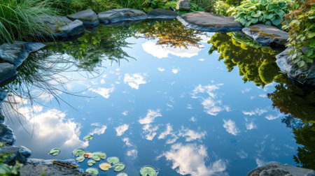 Tranquil garden pond with clear water reflecting blue sky, surrounded by lush greenery and rocks.