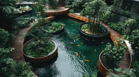 An aerial view presents a serene garden pond setting, featuring koi fish swimming amidst circular planters overflowing with foliage. Wooden pathways gracefully arc over the water, which reflects natural light. The composition evokes a sense of tranquility. Ideal for commercial applications related to landscape design, relaxation, and nature.