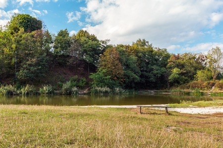 Bench by lake in early fall at park in Lviv, beautiful landscape, Ukraine