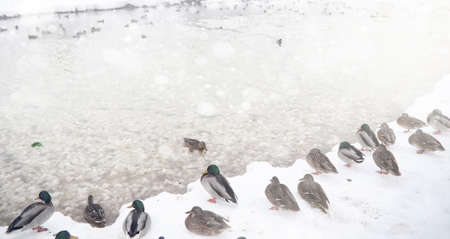 Ducks and spleen in snowy weather on the river with snow-covered shores swim in water with a strong flow and walk through the snow and ice on the shore in search of food.