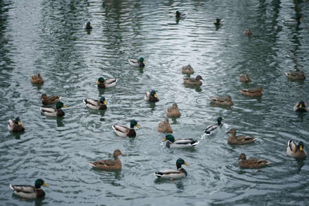 Mallard ducks herd on pond in city at winter.