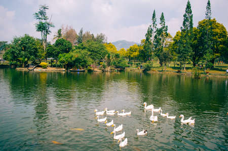 Bogor, Indonesia - A view of the flower themed park Taman Bunga Nusantara in a cloudy afternoon with a view to a green water lake and white ducks and orange fishes swimming together.