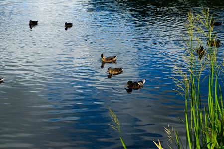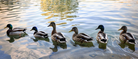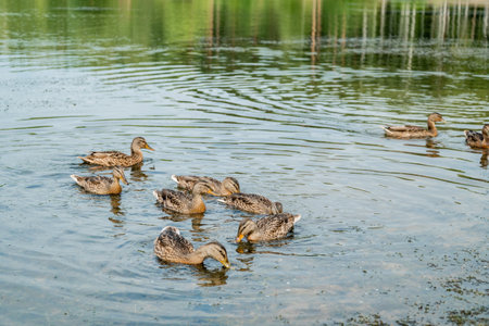 A flock of mallard ducks swims in the pond on a sunny summer day.