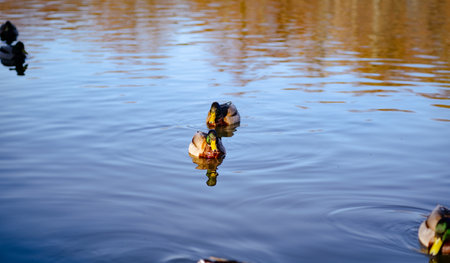 Wild ducks in a city park on a warm autumn day