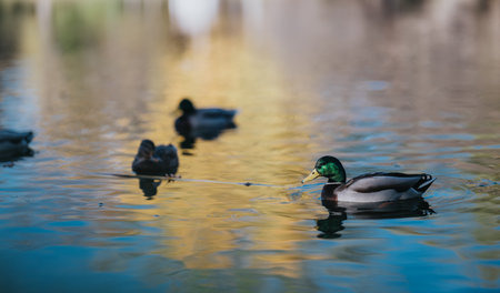 Mallard ducks swimming in the lake. Shallow depth of field.