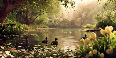 Two ducks swimming on a calm lake, with colorful flowers blooming in the foreground, creating a tranquil springtime scene