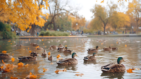 Group of ducks swimming in a tranquil pond surrounded by autumn foliage, creating a picturesque fall scene
