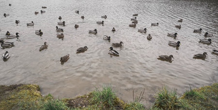 Flock of wild mallard ducks swim on lake