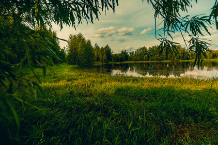 Beautiful summer landscape. Green meadow and lake in the forest.