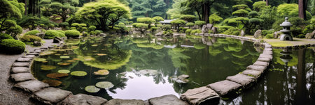 Japanese garden with pond and stone path in the middle of the forest