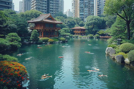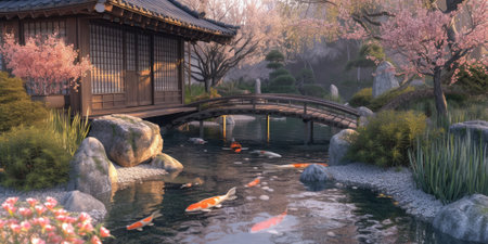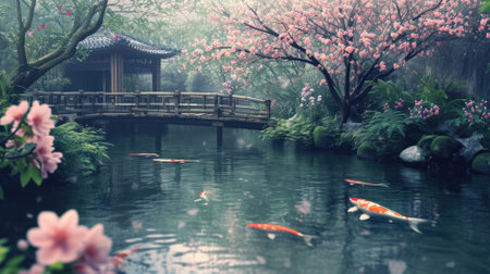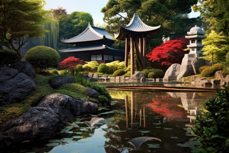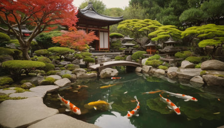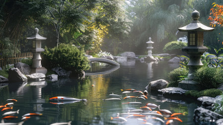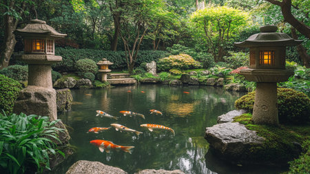 Japanese garden with koi fish and stone lanterns in the garden