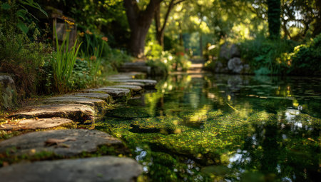 A picturesque pond scene showcases a stone pathway leading through lush greenery. The image features a shallow water body, reflecting the surrounding foliage and creating a sense of depth. Soft lighting illuminates the pathway, emphasizing the textures. This could be useful for projects related to nature, tranquility, or travel.