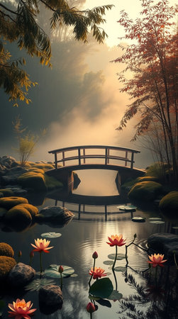 Landscape with pond, bridge and red lotus in the mist
