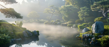 Tranquil Japanese Garden in Misty Morning Light cut elements, themed designs.