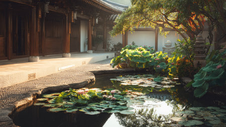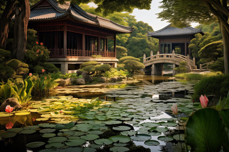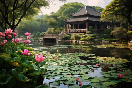 This stunning image captures a peaceful Asian garden featuring a serene pond adorned with blooming lotus flowers, framed by traditional architecture.