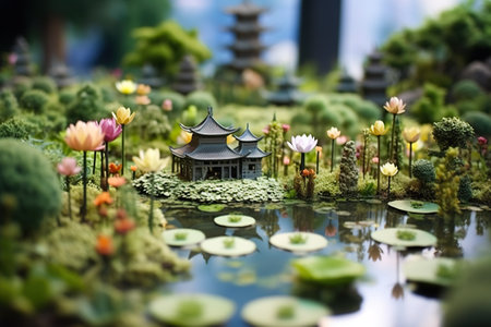 A miniature garden with water lilies and a pagoda. Generative AI.