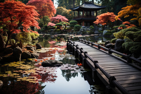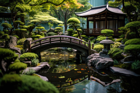 A Japanese Zen garden with a small pond and bridge, AI generated