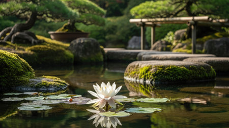 Japanese garden with a lotus flower and bonsai in the background