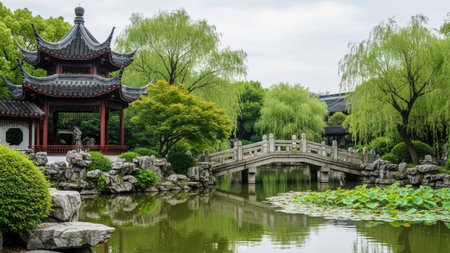 Beautiful chinese garden with pond and bridge in the morning.
