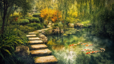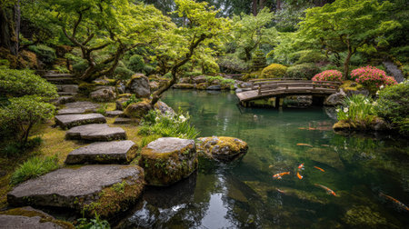 Discover the beauty of a peaceful garden scene featuring lush greenery, a tranquil pond, and stone pathways that invite relaxation and reflection in nature's serene embrace.