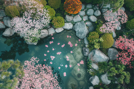 A bird's-eye view of a tranquil pond adorned with pink water lilies, surrounded by lush greenery and rocks.