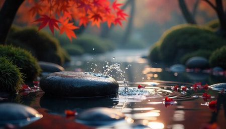 Zen garden with flowing water and autumn leaves serenity