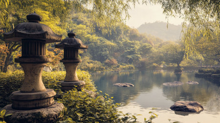 Experience the tranquility of a Japanese garden featuring stone lanterns, calm waters, and lush greenery, creating a peaceful natural escape in a serene landscape.