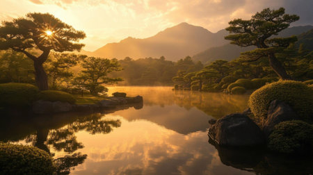 A breathtaking view of a Japanese garden at sunrise, showcasing lush foliage and a tranquil pond reflecting the majestic mountains, creating a serene atmosphere perfect for relaxation.
