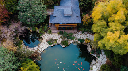 A serene aerial view of a Japanese garden features a tranquil pond filled with koi fish, surrounded by lush trees and a charming house, ideal for relaxation.