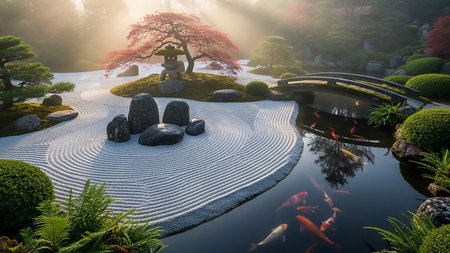 A tranquil Japanese Zen garden features meticulously raked white sand, a calm pond with colorful koi fish, and a stone lantern under a red maple tree.