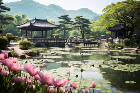 Korean traditional garden with lotus and pond,3d render, AI Generated