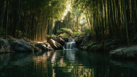 A tranquil scene showing a bamboo forest with a soft waterfall cascading into a reflective pool, enveloped in lush greenery, perfect for relaxation and peaceful meditation moments.