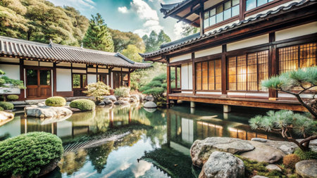 A tranquil Japanese garden featuring a traditional wooden house surrounded by lush greenery and a serene pond, perfect for relaxation and outdoor enjoyment.