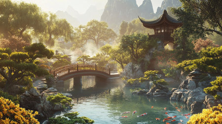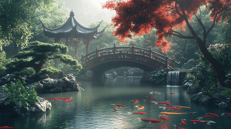Chinese garden with koi carp and bridge in the middle of the pond