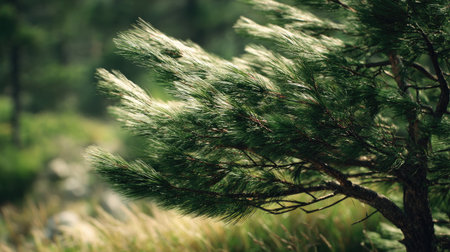 A detailed photograph of a single Lodgepole pine, swaying gently in the wind, captured in natural daylight. Fresh and airy atmosphere, soft motion blur on leaves, crisp details on textures, background softly blurred into natural greenery, cinematic natural light, realistic photography style.
