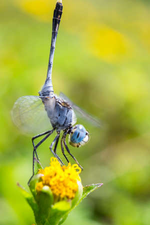 blue dragonfly is on top twist flower of plant