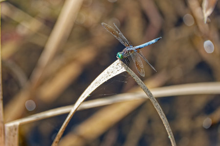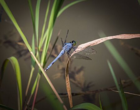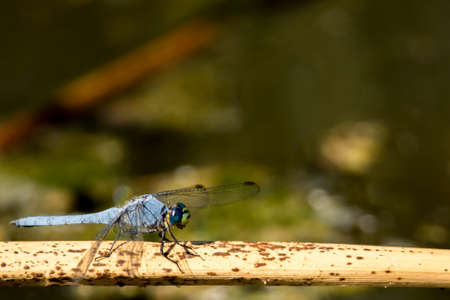 Medium size dragonfly with large green eyes and a light blue body perched on a dead bent reed plant in the lake on a sunny day in summertime