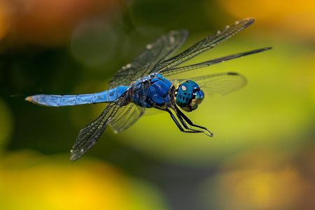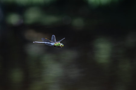 Dragonfly in flight over the water with a blurred background and copy space