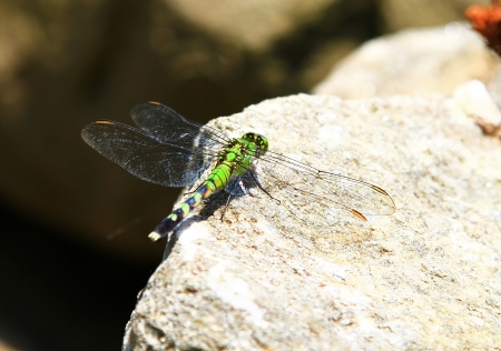 Green dragonfly waiting for a bug to eat on bricks