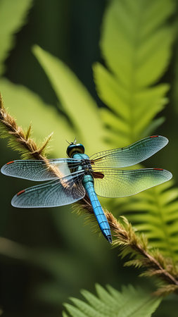 An AI generated illustration of a dragonfly on lush green grass with its delicate wings spread out in a beautiful display