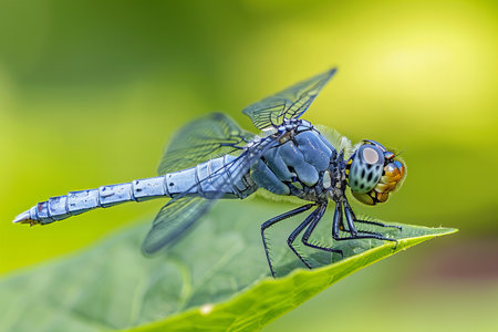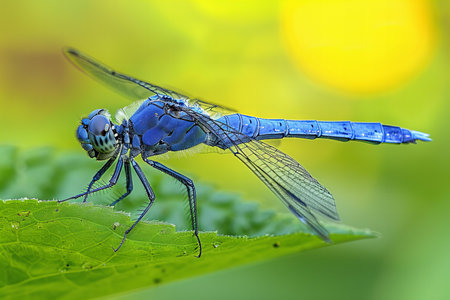 Close up of a blue dragonfly on a green leaf in nature.