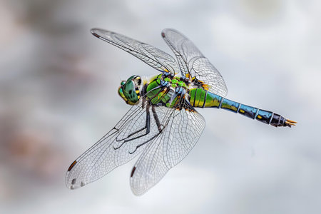 dragonfly with large eyes and shining wings flying on blue sky background