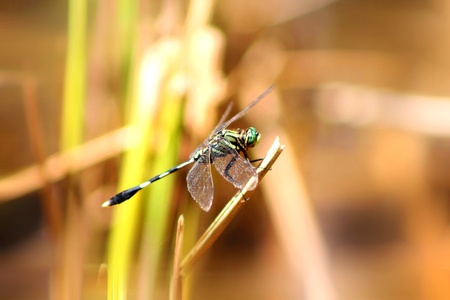 Dragonflies rest on the end of the rice stem