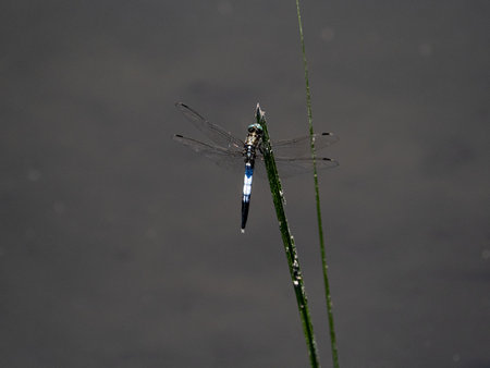 A Japanese blue dragonfly rests on a rope fence along a shallow wetland in a Japanese nature preserve in central Kanagawa, Japan