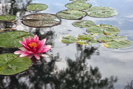 artificial pond with pink flowers of water lilies and green round leaves of lilies an green water in Crimea